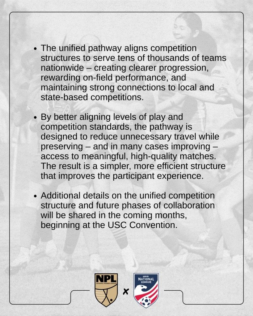 After nearly two years of dialogue between US Club Soccer and US Youth Soccer, the two national associations are aligning to create a unified, team-based competition structure – the integration of US Club Soccer’s National Premier Leagues (NPL) and US Youth Soccer’s National League, starting with the 2026-2027 season. Together with U.S. Soccer, this update marks the first step in a broader effort to strengthen optimal soccer competition platforms among national organizations and local / state leagues.